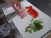 そして、のばした生地にトマトソースを塗り、トッピングをどーん