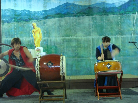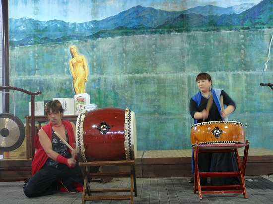 駅の改札口では龍神太鼓の力強い音と、いらっしゃいませ~の言葉に