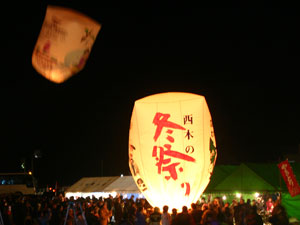 灯火をつけた巨大紙風船がきらめく星々のごとく真冬の夜空に舞い上がります。