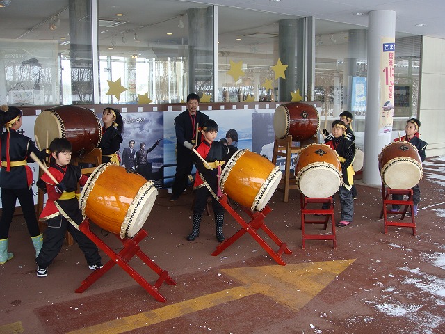 JR田沢湖駅ホームでは、くりっこ太鼓(西木)の元気いっぱいの演奏