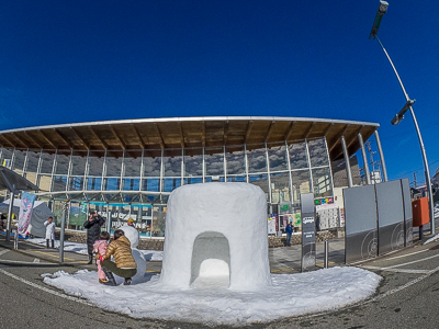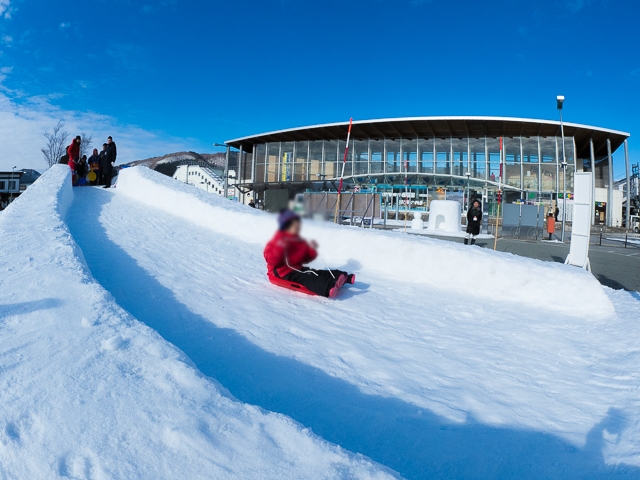 駅前の「雪のすべり台」では、たくさんの子供たちで賑わっていました!