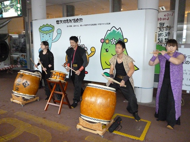田沢湖龍神太鼓の演奏で歓迎(列車到着に合わせて)