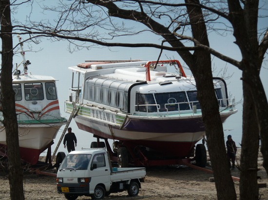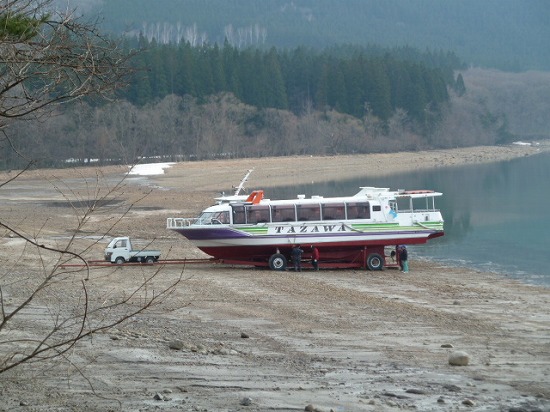 田沢湖の遊覧船が格納庫から湖畔に出てきまして点検中です。