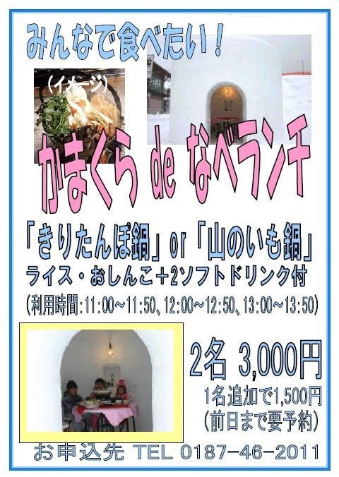 お申込先:0187-46-2011こんな寒い冬こそ楽しめるかまくらdeランチ,