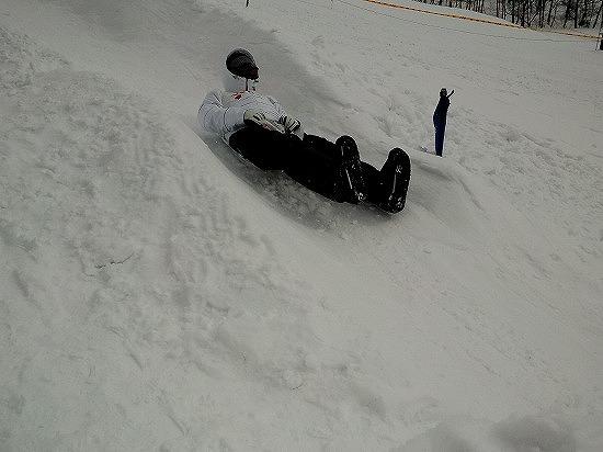 大会規定の“そり”(肥料袋)を『けっち』(お尻)に敷いて滑ると言う、いかにも