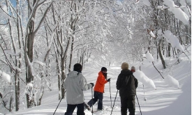 西洋かんじき「スノーシュー」を履いて雪原を自由に歩いたり、乳頭ブナの森コースや