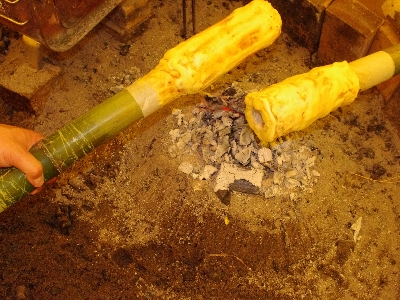 竹に生地を何層も塗り重ねて焚き火でじっくり焼いていきます