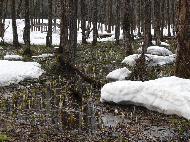 『刺巻湿原のミズバショウ』はなんせまだ雪が降っているくらいですから