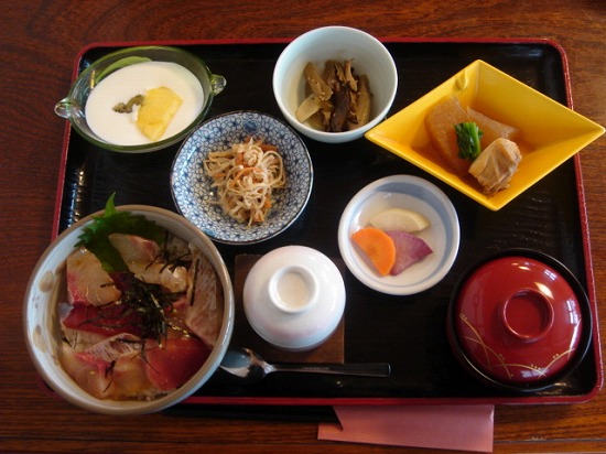 でどんぶり以外にも茶碗蒸しや切干大根山菜(蕗)の炒め物、ぶり大根、デザートにはヨーグルトとサイドメニューが豊富で大満足