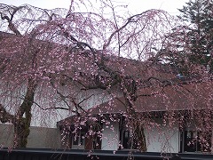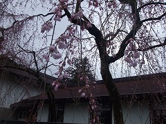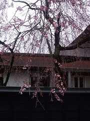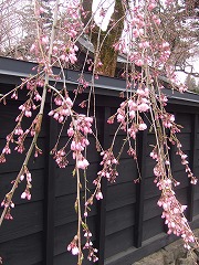 武家屋敷、伝承館前の枝垂れ桜で3分咲