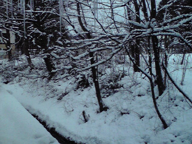 今日の事務所の裏手です。木の枝に雪が積もって花が咲いたよう・・それでも、昨日は久しぶりにスノーダンプ(ママさんダンプともいう)を