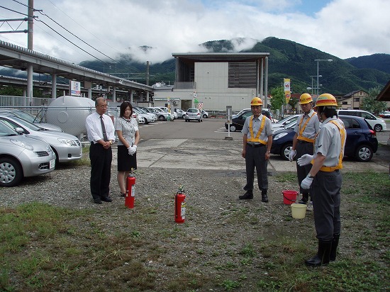 今回は消火器の取り扱い、火災消火、迅速な避難・救助など火災を想定した訓練で