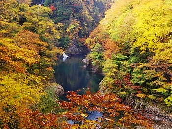 東北の耶馬渓と称される美しさで、秋は紅葉の名所となっており