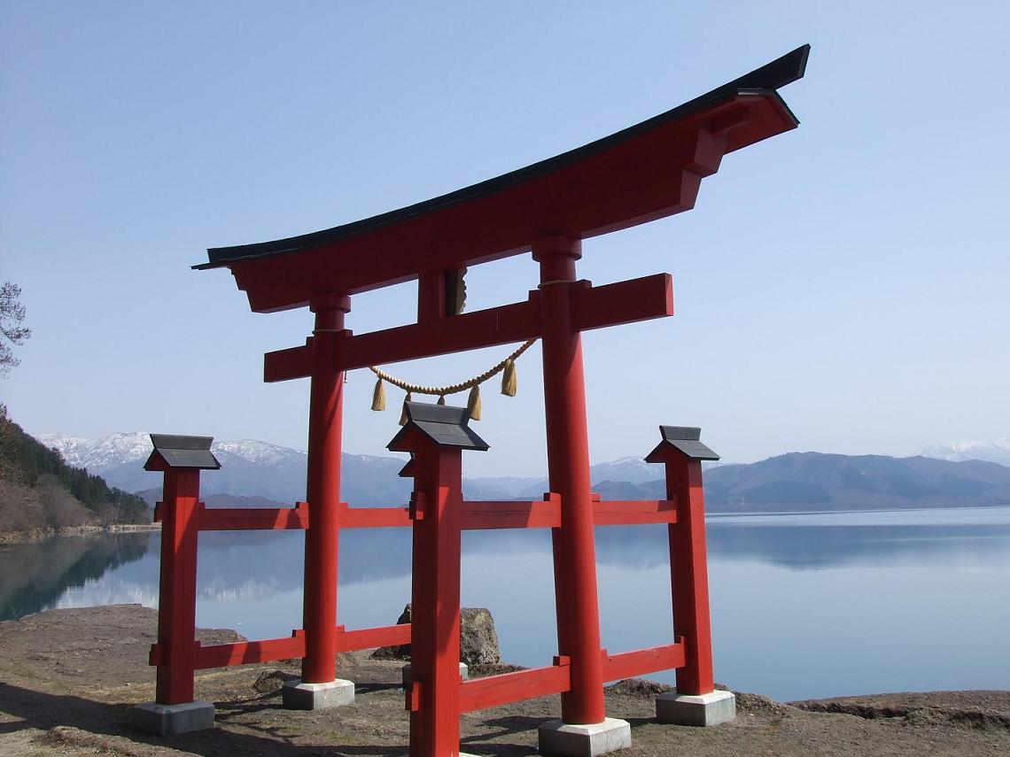 この湖の青と鳥居の赤の見事な色のマッチン グ~