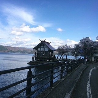 浮木神社の桜も見ごろとなっていて、観光客の方々も桜と湖をパシャリ