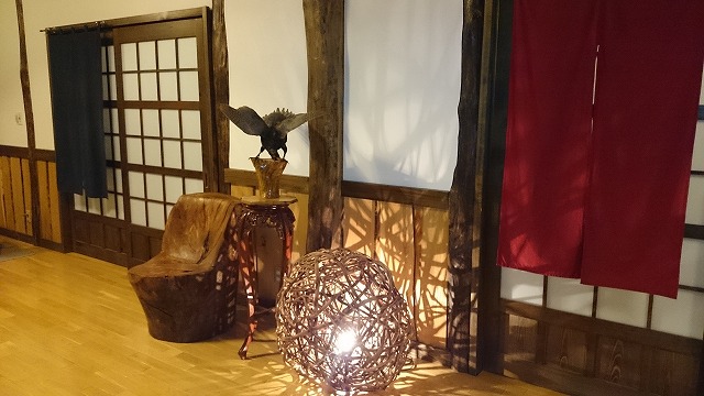 素敵なオブジェが飾っている休憩所とお風呂が見えてきます